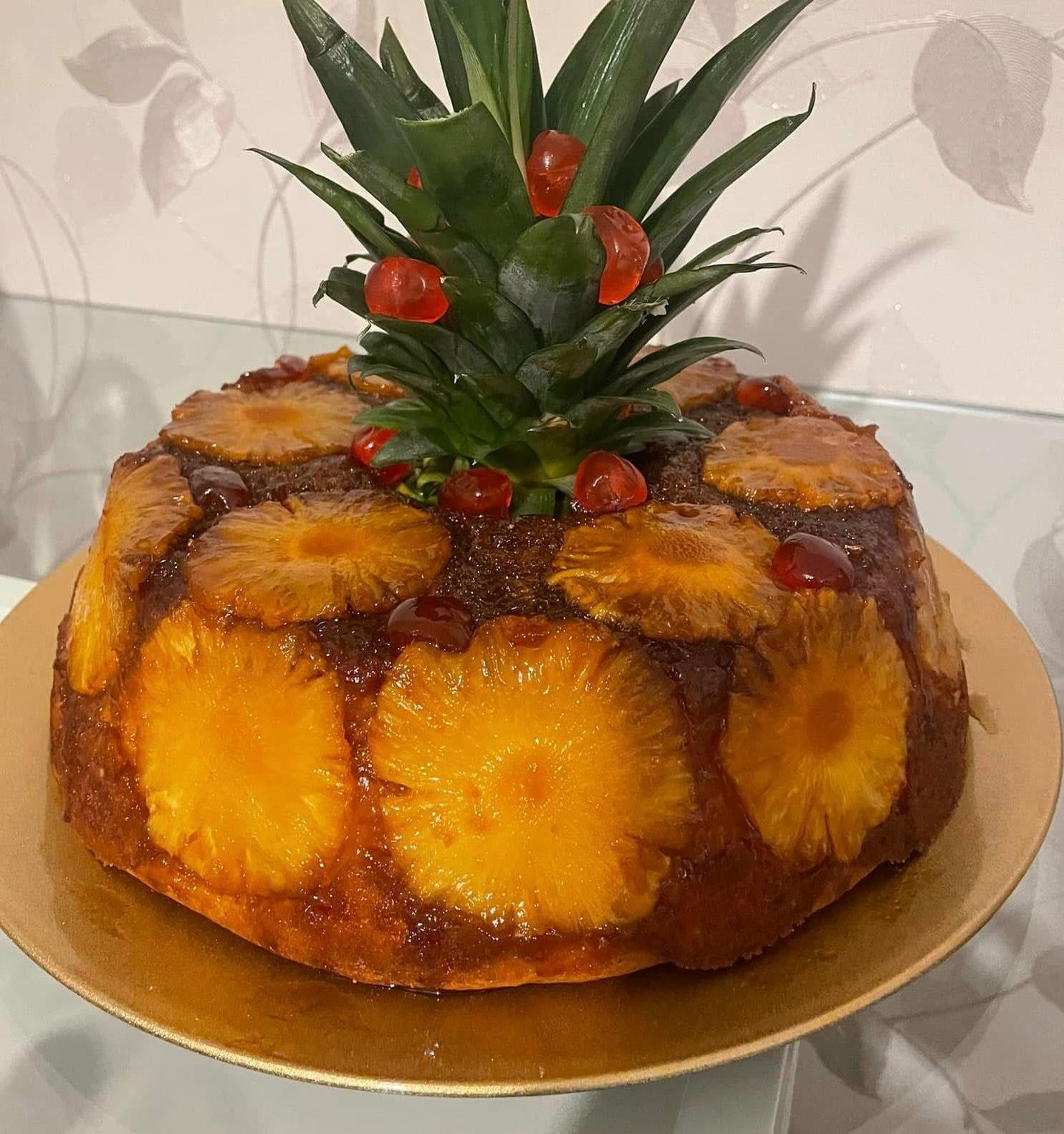 Um exuberante bolo de ananás caramelizado, preparado no estilo invertido, onde as rodelas de ananás são cuidadosamente dispostas e envolvidas numa rica calda de caramelo dourado. Após desenformado, revela uma superfície brilhante e suculenta, com frutas macias que contrastam perfeitamente com a massa leve, húmida e delicadamente doce.