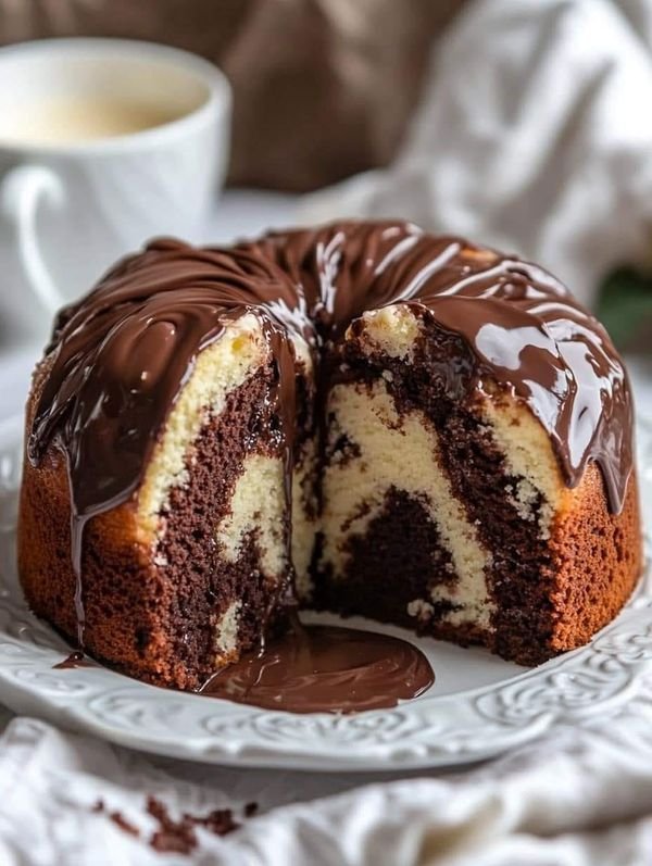 Um clássico bolo de mármore, com uma textura macia e fofa, onde se combinam delicadamente massas de baunilha e chocolate. O seu característico efeito marmorizado cria um visual elegante e único em cada fatia.