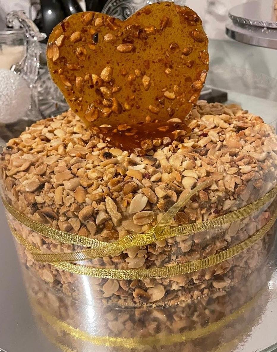 Delicie-se com o sabor rico e envolvente do nosso Bolo de Ginguba, preparado artesanalmente com amendoins selecionados. Este bolo irresistível é coberto com uma generosa camada de amendoim crocante e finalizado com um delicado crocante caramelizado, que traz o equilíbrio perfeito entre doçura e textura.