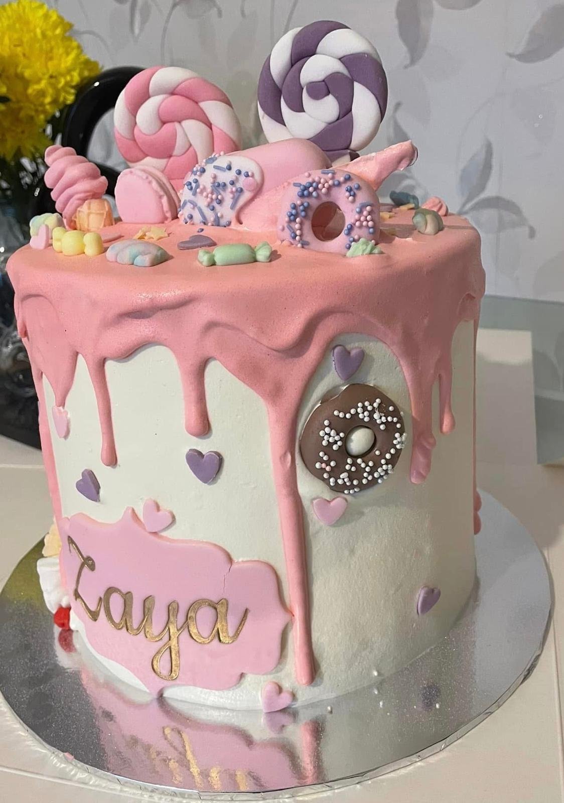 Um bolo encantador inspirado no universo doce e colorido das guloseimas, perfeito para festas cheias de alegria e fantasia. Com tons suaves em rosa e branco, apresenta um efeito drip delicado e é decorado com elementos divertidos como donuts, pirulitos e doces, criando um visual irresistível e cheio de personalidade.