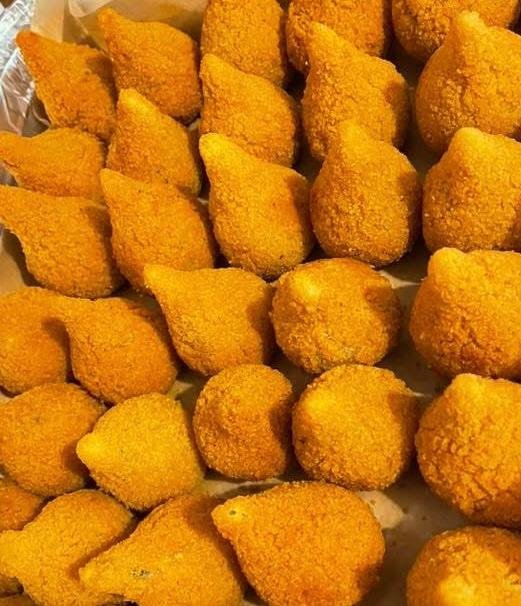 Cada unidade é cuidadosamente moldada no formato tradicional, panada e frita até ficar dourada e crocante por fora, mantendo um interior cremoso e saboroso que conquista a cada dentada.