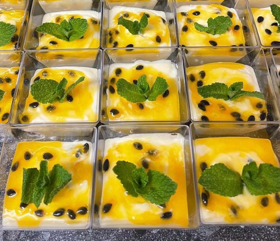 Servida em copinhos individuais, é finalizada com uma deliciosa calda de maracujá, sementes naturais e um toque de hortelã, que realçam o frescor e a apresentação. Uma sobremesa leve, elegante e perfeita para qualquer ocasião.
